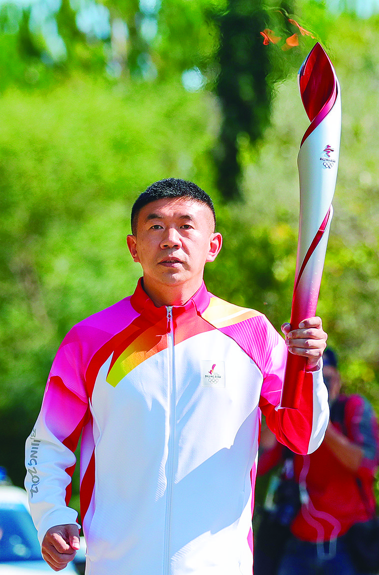 右图 前短道速滑运动员李佳军传递火炬。新华社记者 郑焕松摄