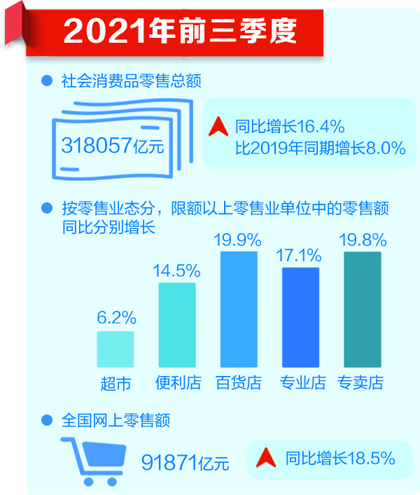 前三季度,商品零售额同比增长15.0%,比2019年同期增长9.1%。