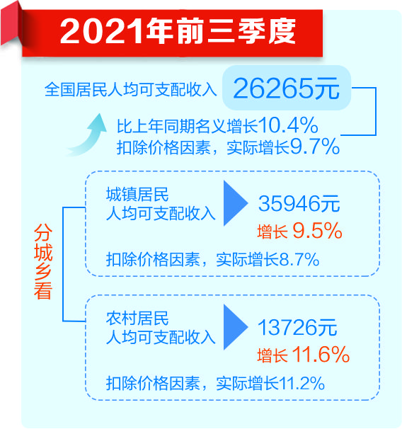 前三季度,全国居民人均可支配收入26265元,实际增长9.7%,在上年基数较低的情况下继续恢复性增长。受疫情、汛情等因素影响,前三季度居民收入名义增速和实际增速有所放缓,分别比上半年放缓2.2个和2.3个百分点。
