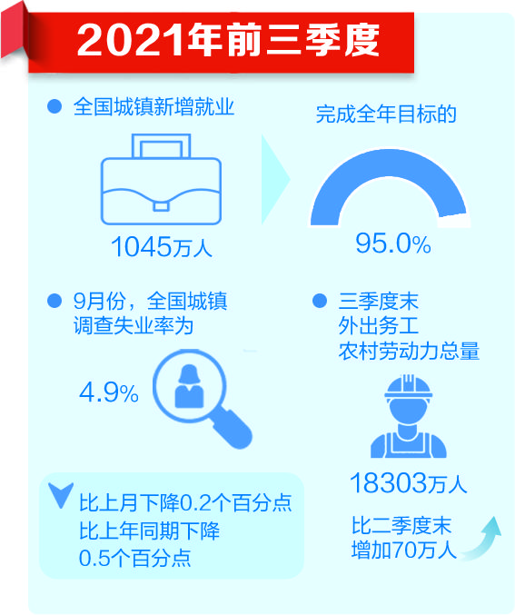 总体来看,1月份至9月份,全国城镇调查失业率均值为5.2%,低于5.5%左右的全年宏观调控预期目标。同时,1月份至9月份城镇新增就业1045万人,完成预期目标的95%,新增就业目标完成情况良好。