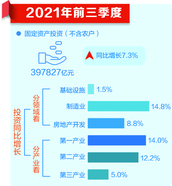 今年以来,各地区各部门认真贯彻落实党中央、国务院各项决策部署,加大稳投资促转型力度,发挥地方政府专项债作用带动扩大有效投资,固定资产投资稳定增长,结构持续优化。前三季度,全国固定资产投资(不含农户)同比增长7.3%,以2019年前三季度为基期,两年平均增速为3.8%。
