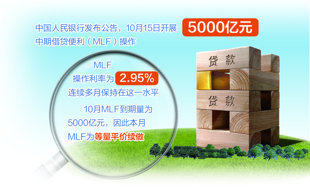 10月15日,月中“麻辣粉”(MLF)如期端出。中国人民银行发布公告称,为维护银行体系流动性合理充裕,15日开展5000亿元中期借贷便利(MLF)操作(含对10月15日MLF到期的续做)。MLF操作利率为2.95%,与9月持平,并连续多月保持在这一水平。10月MLF到期量为5000亿元,因此本月MLF为等量平价续做。