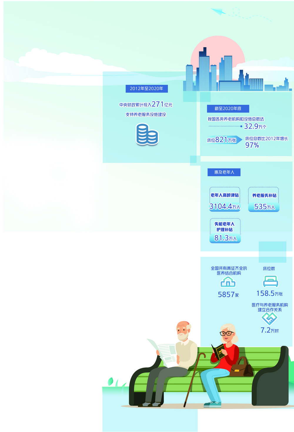 民政部数据显示,2012年至2020年,中央财政累计投入271亿元支持养老服务设施建设。截至2020年底,我国各类养老机构和设施总数达32.9万个、床位821万张,床位总数比2012年增长97%。老年人高龄津贴、养老服务补贴、失能老年人护理补贴分别惠及3104.4万、535万、81.3万老年人。