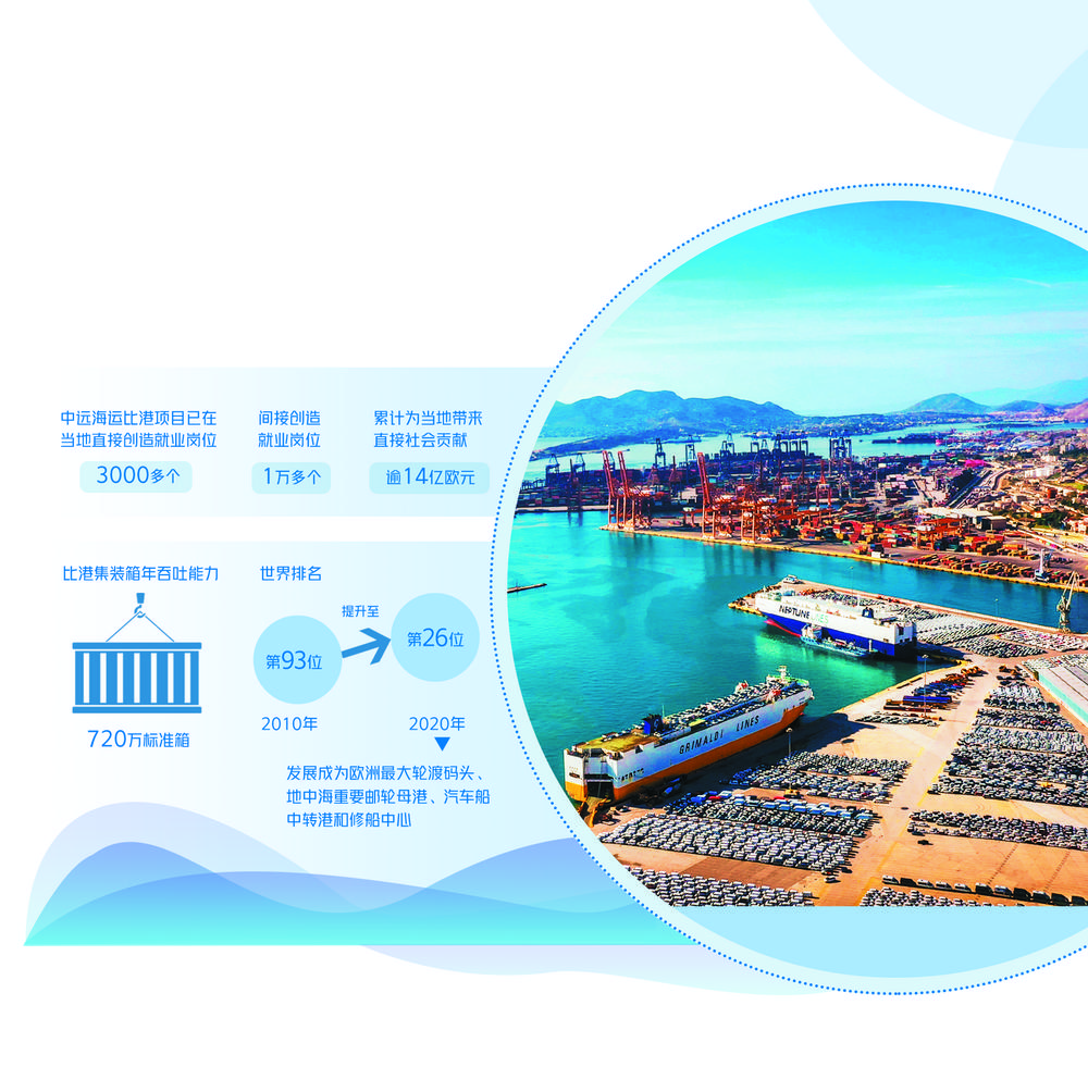 数据显示,截至目前,项目已在当地直接创造就业岗位3000多个,间接创造就业岗位1万多个,累计为当地带来直接社会贡献逾14亿欧元,2020年对希腊GDP的贡献达0.78%。同时,比港集装箱年吞吐能力达720万标准箱,世界排名从2010年的第93位提升至2020年的第26位,发展成为欧洲最大的轮渡码头、地中海重要的邮轮母港、汽车船中转港和修船中心。港区内连通中欧陆海快线直达中东欧腹地,是“21世纪海上丝绸之路”通往中东欧的门户。近年来,以比港为起点的中欧陆海快线快速发展,成为辐射中东欧9个国家、共7100万人口的中欧贸易第三条大通道。
