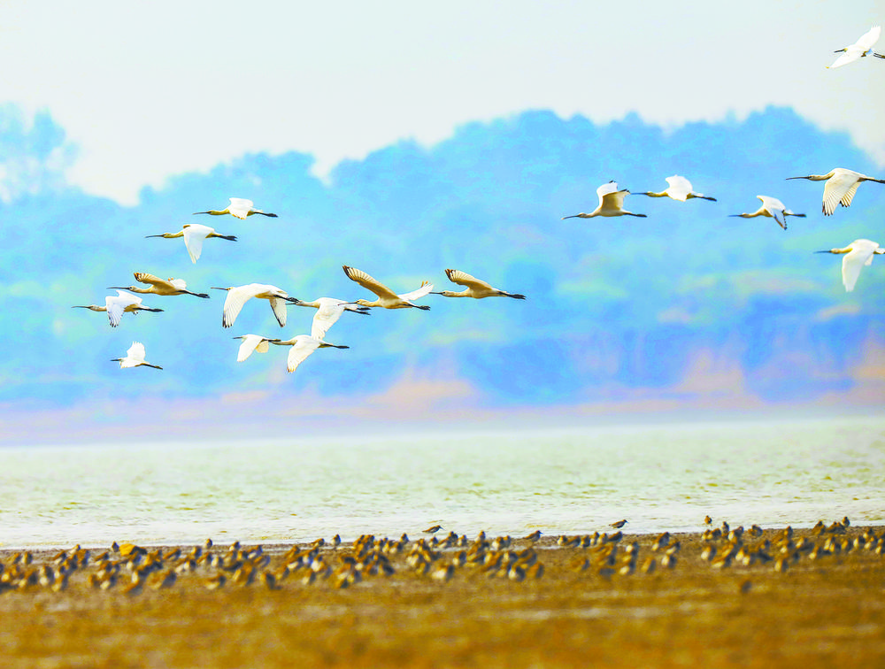 上图 10月23日,成群珍稀越冬候鸟白琵鹭飞抵鄱阳湖江西省九江市湖口县湿地。