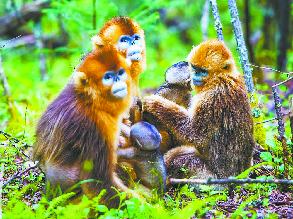 左图 金丝猴在神农架国家公园大龙潭金丝猴野外研究基地山林中活动(5月19日摄)。