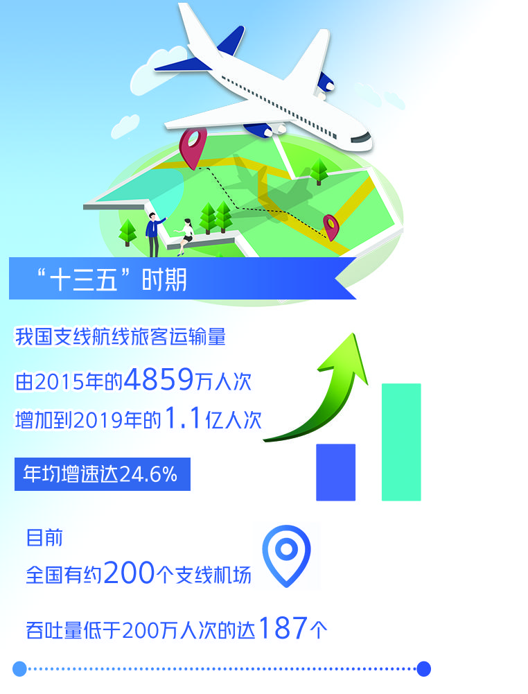 发展支线航空还应当大力推进支线机场建设。目前,全国有约200个支线机场,吞吐量低于200万人次的达187个。“十四五”期间,大力推进支线机场的建设是民航工作的重中之重。