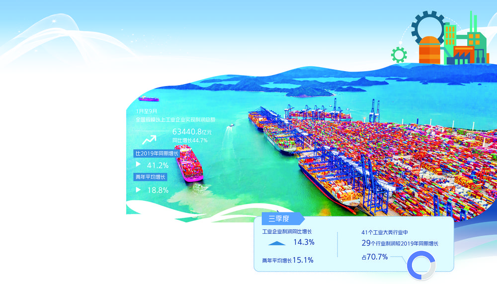 国家统计局日前发布数据显示,1月至9月,全国规模以上工业企业实现利润总额63440.8亿元,同比增长44.7%,比2019年同期增长41.2%,两年平均增长18.8%。