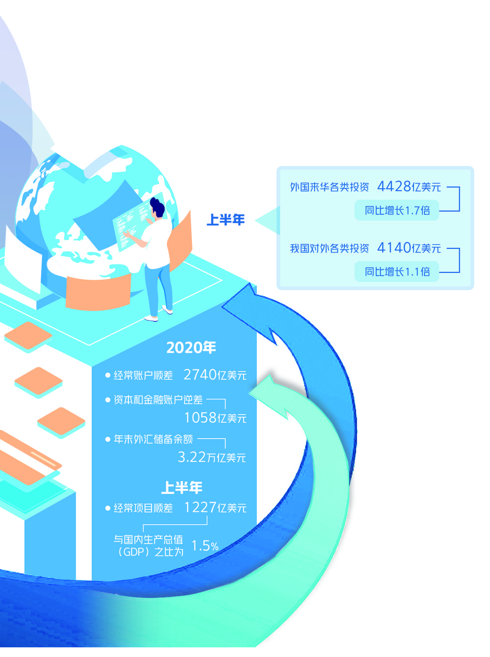 这一格局在今年得以延续。从经常项目看,顺差继续处于合理区间,保持大体均衡。上半年,经常项目顺差1227亿美元,与国内生产总值(GDP)之比为1.5%,2020年全年为1.9%。“国际上通常将经常项目差额在GDP的4%以内视为国际收支平衡的重要指标。我国加入世贸组织后国际贸易蓬勃发展,2007年经常项目占GDP比重一度接近10%。近年来,我国经济发展方式发生深刻转变,经常项目顺差逐步走向合理均衡区间,2016年以来占GDP比重均不到2%。”国家外汇管理局副局长宣昌能介绍。