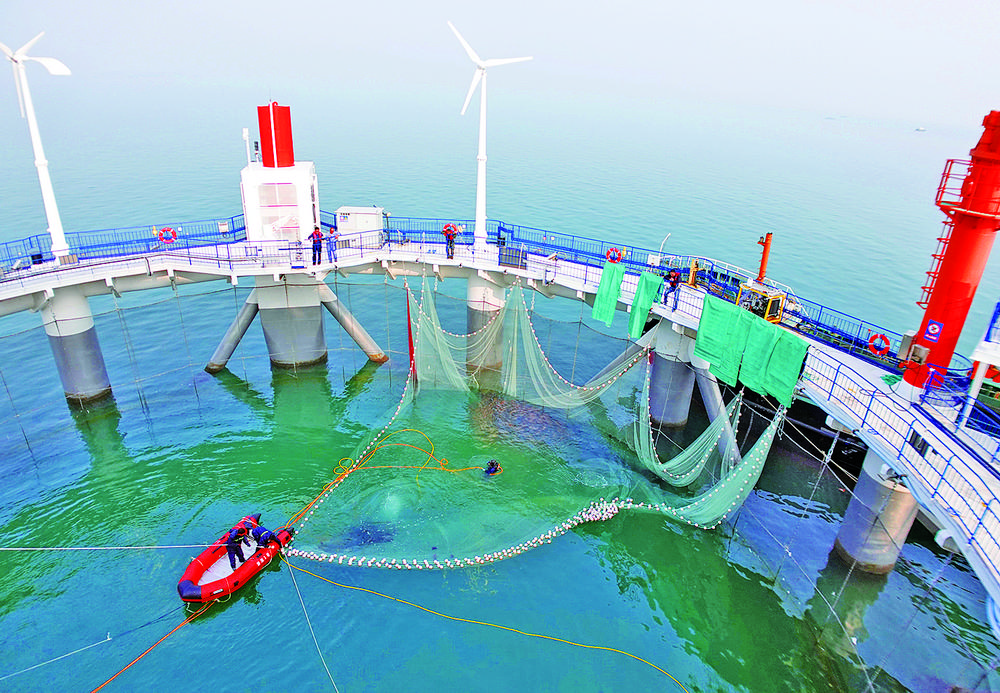 10月26日,位于山东烟台市莱山区四十里湾海域的“耕海1号”海洋牧场综合体平台迎来收获季,工作人员把在准野生环境中生长的真鲷、斑石鲷等鱼类从网箱中转运上岸,预计产量可达5000多斤。近年来,烟台市大力发展以海洋牧场为代表的现代渔业,目前烟台市已拥有18个国家级、37个省级海洋牧场,海洋牧场总面积达125万亩。