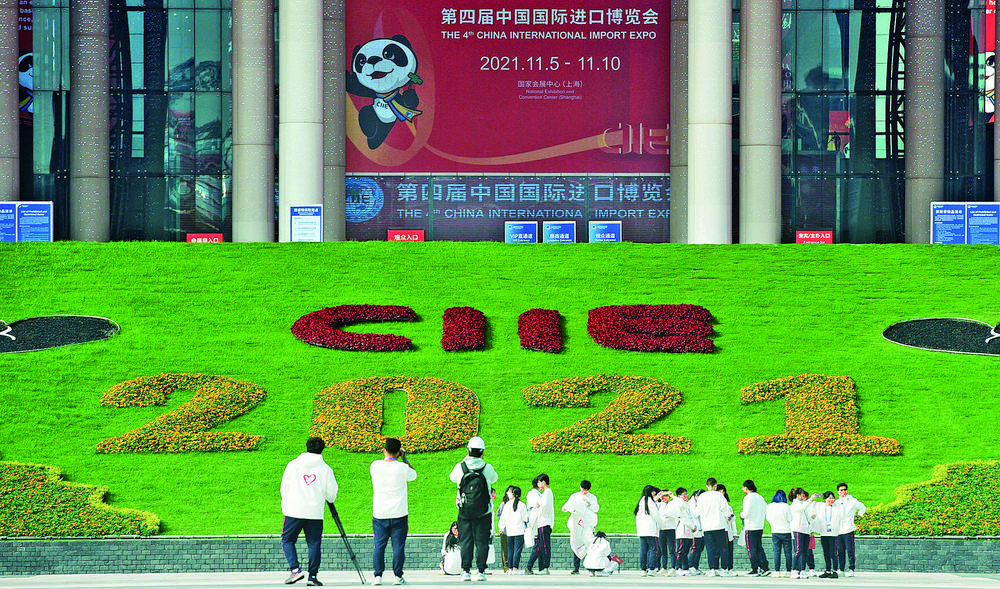 11月1日,志愿者准备在中国国际进口博览会主题花坛前合影留念。