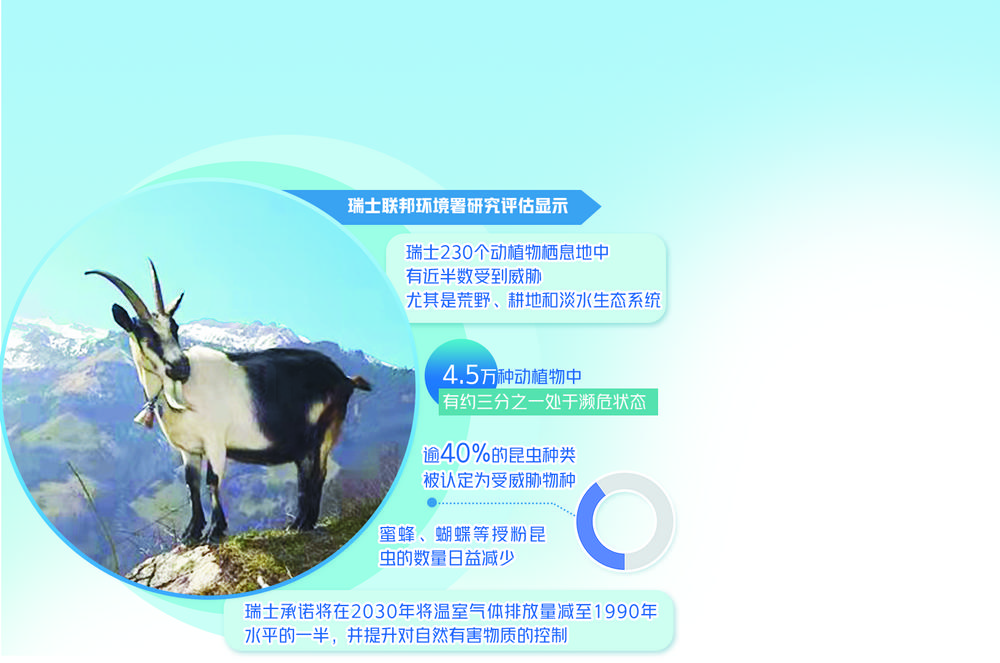 瑞士素以湖泊草地森林密布,动植物资源丰富,环境保护居世界先进水平闻名于世,有着“花园国家”的美誉。但是,面对气候变化和环境污染等全球性挑战,拥有先进环保理念、法律和科技的瑞士,同样承受着保护生物多样性的压力。