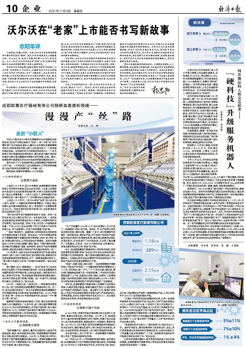 “从高分子材料研究到生物膜材料应用,从单一血液透析器到多系列血液透析产品,创业至今,我们已经投资超过3亿元,从最初几间办公室、十多名员工到今天发展成为一家拥有4.7万平方米生产基地,近500名员工的高新技术企业。2020年我们还获得了四川省科学技术进步一等奖。”最让成都欧赛医疗器械有限公司董事袁兴红感到自豪的是,公司现已与四川大学共建血液净化膜材料研发中心,并成为国家“十三五”重点项目“可穿戴式人工肾”技术研发及产业化牵头单位。