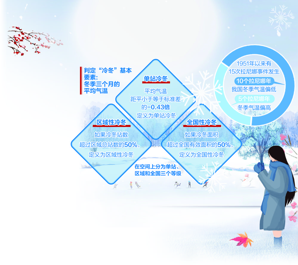 但今冬究竟是不是冷冬?国家气候中心副主任贾小龙解释称,需要注意的是,气温“偏冷”不等于“冷冬”。“偏冷”是针对气候平均而言气温偏低还是偏高,但“冷冬”有严格的阈值标准。判定“冷冬”的基本要素为冬季三个月的平均气温,在空间上分为单站、区域和全国三个等级。单站平均气温距平小于等于标准差的-0.43倍就定义为单站冷冬;如果冷冬站数超过区域总站数的50%,则定义为区域性冷冬;如果冷冬面积超过全国有效面积的50%,则定义为全国性冷冬。即冷冬的标准与气温偏低的程度和范围均有关系。