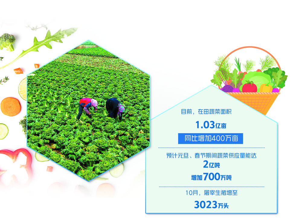 “不过,全年及当前包括元旦、春节期间,全国蔬菜生产总体是正常的。”唐珂告诉记者,从目前看,在田蔬菜面积达1.03亿亩,同比增加了400万亩,预计元旦、春节期间蔬菜供应量能够达到2亿吨、增加700万吨。从区域看,“南菜北运”的7个省份和北方设施蔬菜的6个省份,陆续进入蔬菜采收旺季,能有效增加和保障市场供应。