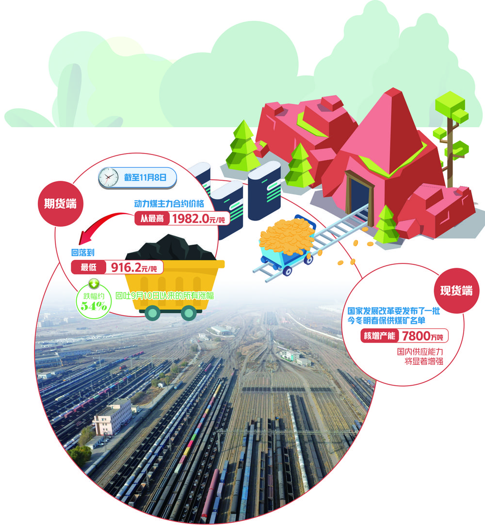 一系列举措后,动力煤期货价格应声跳水。截至11月8日,动力煤主力合约价格从最高1982.0元/吨回落到最低916.2元/吨,跌幅约54%,回吐9月10日以来的所有涨幅。