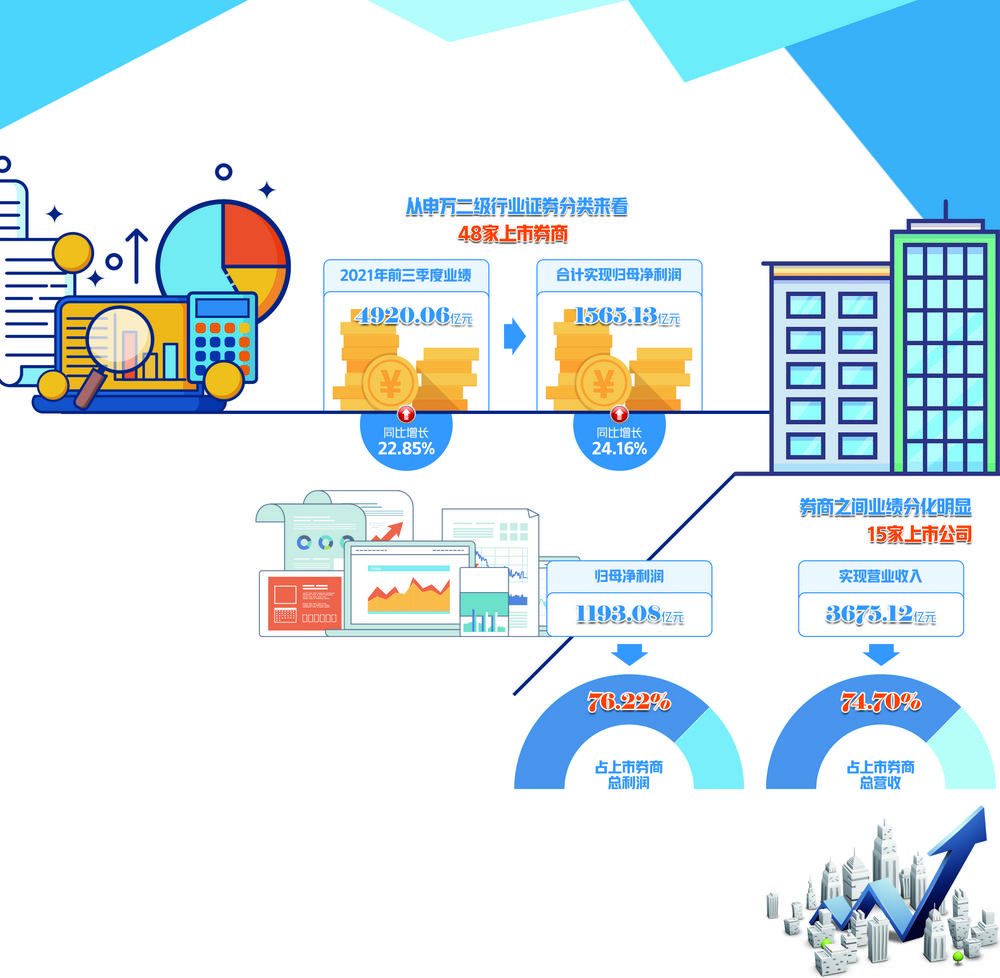在三季度市场交投持续活跃的带动下,多家券商业绩表现抢眼。据同花顺iFind数据显示,从申万二级行业证券分类来看,48家上市券商2021年前三季度业绩已完全披露,合计营业收入达到4920.06亿元,同比增长22.85%;合计实现归母净利润1565.13亿元,同比增长24.16%。大部分券商业绩上升,然而中小券商多家业绩下滑。