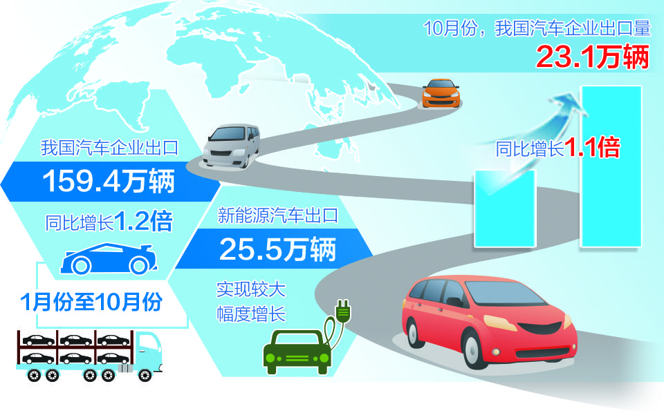 数据显示,1月份至10月份,我国汽车企业出口159.4万辆,同比增长1.2倍。分车型看,乘用车出口125.8万辆,同比增长1.3倍;商用车出口33.6万辆,同比增长86.0%。