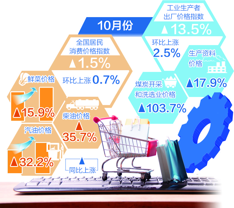 11月10日,国家统计局发布数据显示,10月份,全国居民消费价格指数(CPI)同比上涨1.5%,环比上涨0.7%;工业生产者出厂价格指数(PPI)同比上涨13.5%,环比上涨2.5%。CPI与PPI同比增速的“剪刀差”进一步扩大。