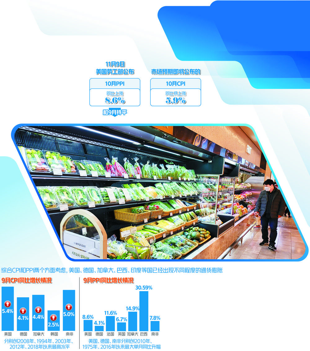 11月4日,美联储会议决定开始缩减购债,但仍继续强调导致通胀水平上升的因素是暂时的,这和多数市场人士看法不同。11月9日,美国劳工部公布的10月PPI同比上涨8.6%,和9月持平。同时,市场预期即将公布的10月CPI同比将上涨5.9%,加剧了市场对通胀的担忧。