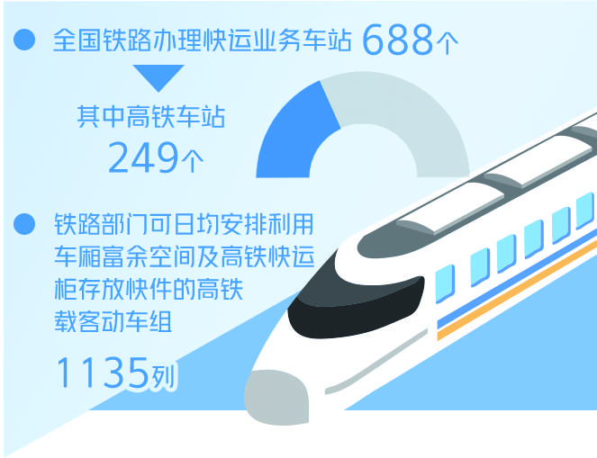 据统计,铁路部门可日均安排利用车厢富余空间及高铁快运柜存放快件的高铁载客动车组1135列,其中,同时预留不售票二等座的动车组35列,日均安排清晨开行、全列无乘客、可装运快件的高铁确认列车32列,日均安排运用行李车装运快件的普速旅客列车240列至320列,日均安排在京广、京沪等干线铁路上运行的北京、上海、广州等城市间特快货物班列8列。在拉萨至林芝铁路沿线的林芝、山南等车站增办快运业务。全国铁路办理快运业务的车站达688个,遍布31个省、自治区、直辖市,其中高铁车站249个。