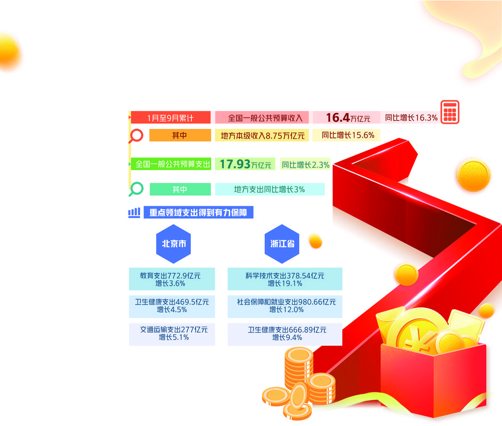 “前三季度,中央和地方的一般公共预算收入均呈现较大幅度上升,根本原因在于国民经济整体运行态势良好,带动了财政收入相应增长。其中,作为财政收入的主要力量,税收收入出现了较大幅度的增长,体现税收对财政收入的拉动作用。”北京国家会计学院财税政策与应用研究所所长李旭红说。