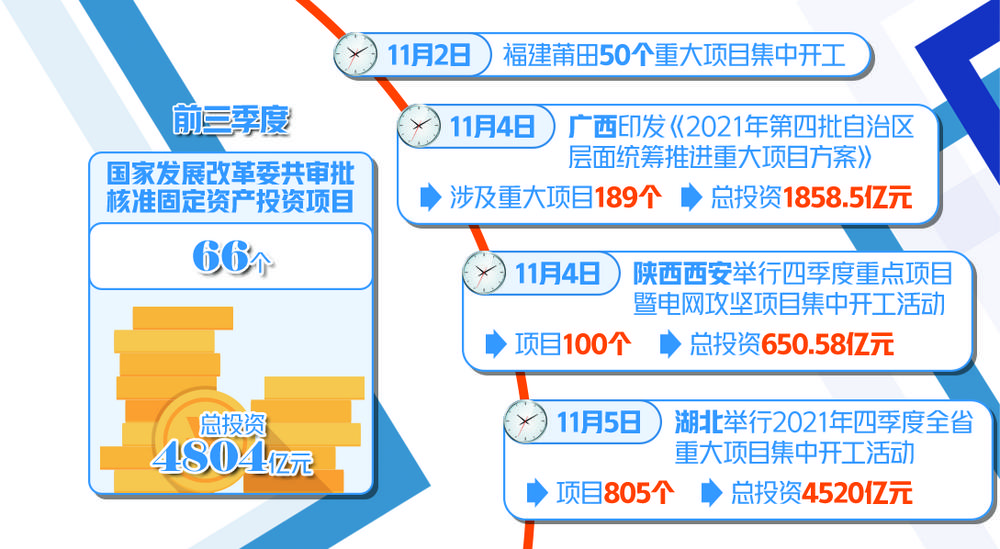 11月4日,广西印发《2021年第四批自治区层面统筹推进重大项目方案》,涉及重大项目189个,总投资1858.5亿元,涵盖交通、新能源、商贸物流、基础设施、卫生事业等多个领域。11月5日,湖北举行2021年四季度全省重大项目集中开工活动,805个项目总投资达4520亿元。