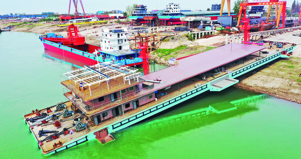 11月12日,湖北省枝江盛懋船业有限公司建造的5000吨级的油库码头作业船,在宜昌船舶工业园下水舾装。该园区是湖北省船舶设计研发展示中心,可为国内外船东建造各型船舶,园区内硬化船台可同时容纳60条100米至150米长的新建船舶。刘卫东摄(中经视觉)