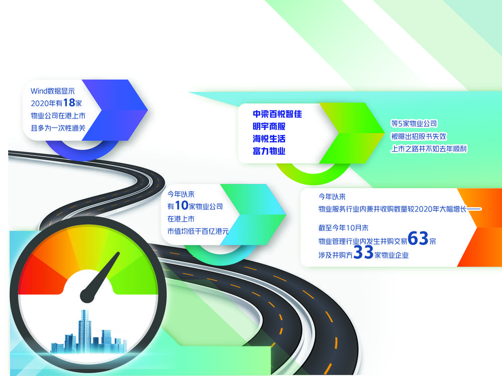 Wind数据显示,2020年有18家物业公司在港交所成功上市,且多数为一次性通关。今年以来有10家物业公司在港交所上市,市值均低于百亿港元,且好几家物业公司被曝出招股书失效,上市之路并不如去年顺利。