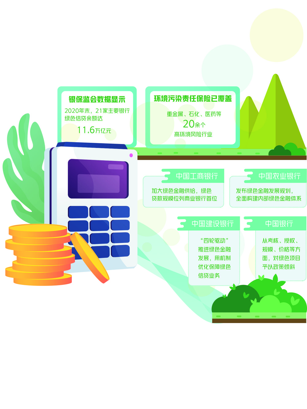 近年来,我国绿色金融发展成效显著。银保监会数据显示,2020年末,21家主要银行绿色信贷余额达11.6万亿元,另外,环境污染责任保险已覆盖重金属、石化、医药等20余个高环境风险行业。