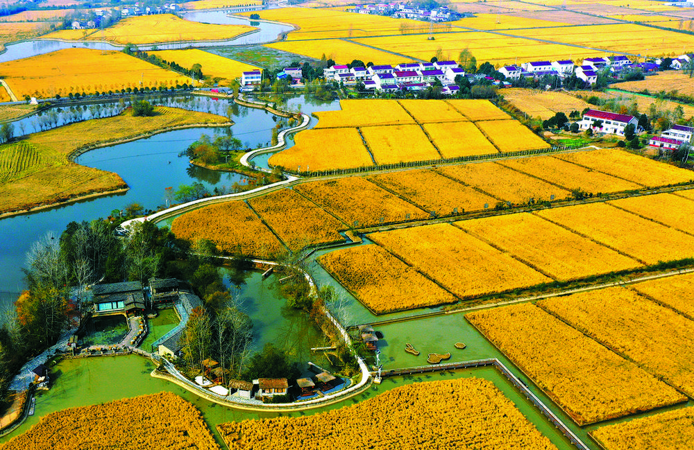 11月16日,安徽省六安市裕安区林寨村1000多亩“林寨雪稻”进入成熟期,金黄的稻谷和纵横交错的水渠融为一体,农民新居掩映其中,成为冬日里的一道亮丽风景。近年来,该村利用淠史杭灌区水系优势,通过鱼稻共养、虾稻共养等实现一水两用,发展高效农业。陈 力摄(中经视觉)