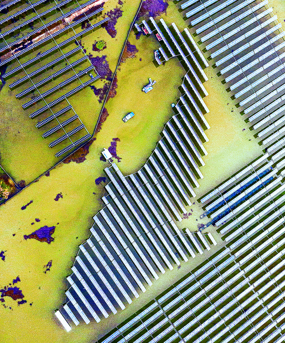 11月15日,在江苏省泗洪县天岗湖浅水滩,排列整齐的光伏设施蔚为壮观。从2017年开始,泗洪县探索发展渔光互补,有力地推动了乡村振兴。许昌亮摄(中经视觉)