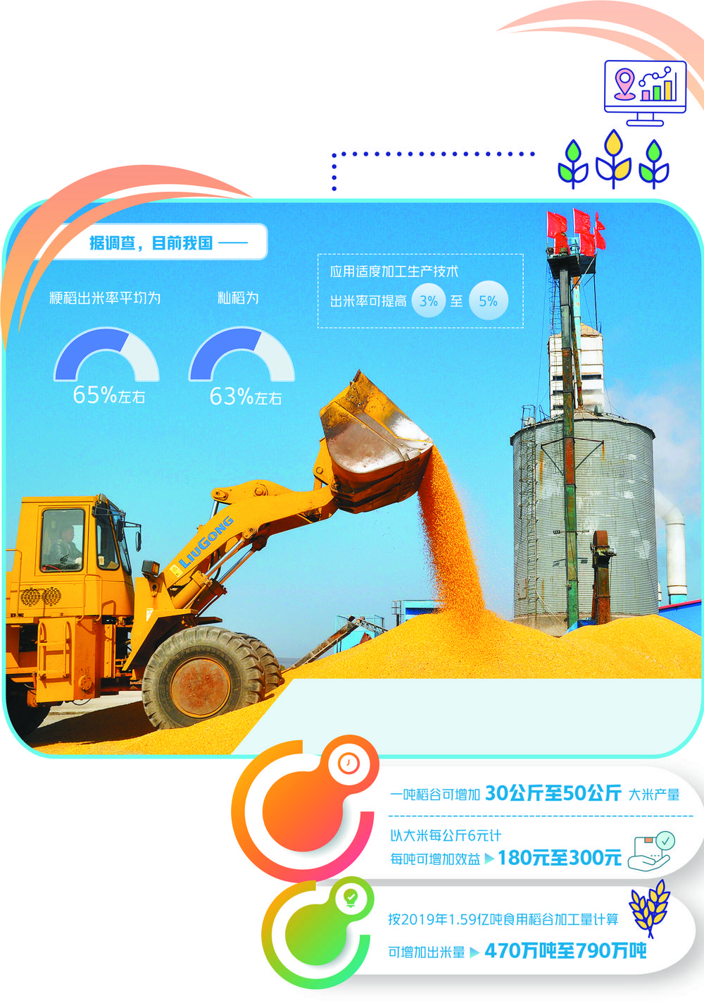 据介绍,实施适度加工可以提高粮食出品率。以大米为例,若适度加工,粳米出米率约为70%,籼米约为68%。据调查,目前我国粳稻出米率平均为65%左右,籼稻为63%左右。应用适度加工生产技术,出米率可提高3%至5%,一吨稻谷可增加30公斤至50公斤大米产量,以大米每公斤6元计,每吨可增加效益180元至300元。按2019年1.59亿吨食用稻谷加工量计算,可增加出米量470万吨至790万吨,以亩产470公斤计算,相当于增加了约1000万亩至1600万亩耕地的稻谷产量。而且,适度加工可以降低企业能耗,提升企业经济效益。