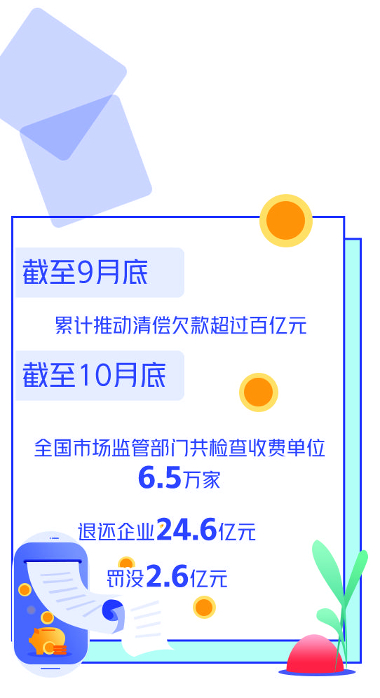 该负责人介绍,为化解拖欠民营企业账款问题,联席会议贯彻落实《保障中小企业款项支付条例》,研究投诉处理办法,加强问题督办,截至9月底,累计推动清偿欠款超过百亿元。此外,重点对中介机构、行业协会商会、商业银行、水电气暖公用事业、交通物流等领域涉企收费开展专项清理。截至10月底,全国市场监管部门共检查收费单位6.5万家,退还企业24.6亿元,罚没2.6亿元。