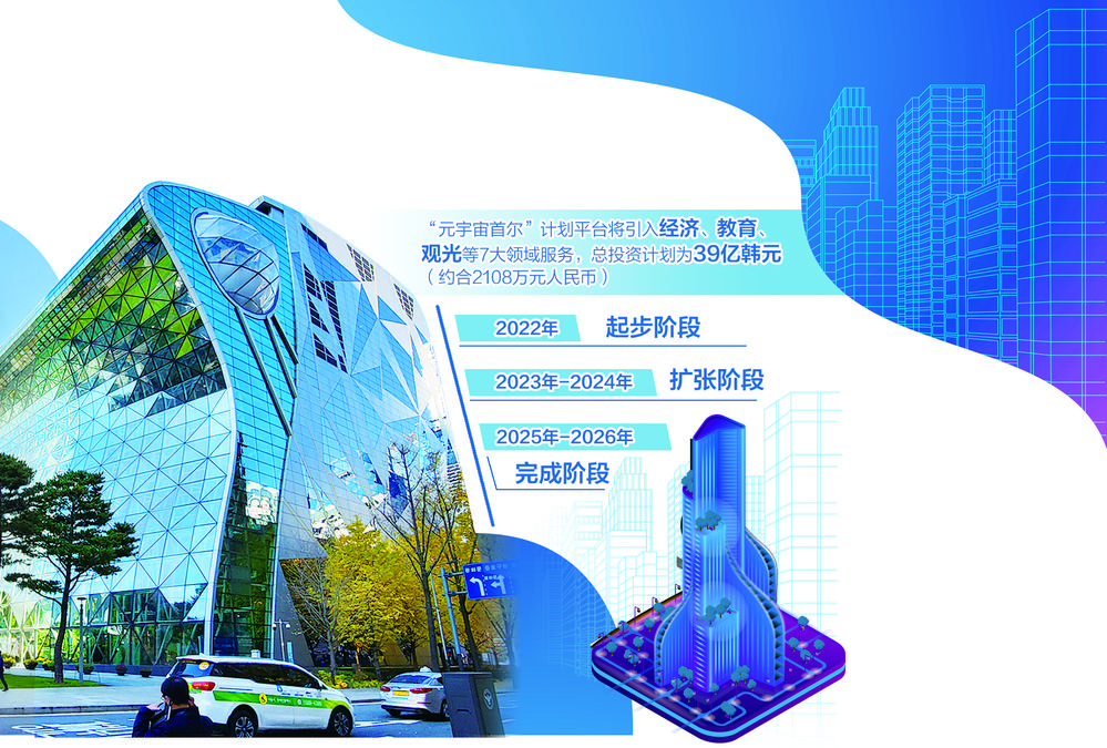 “元宇宙首尔”计划分为“起步(2022年)”“扩张(2023年-2024年)”和“完成(2025年-2026年)”三个阶段。明年将通过第一阶段工作完成平台的搭建,引入经济、教育、观光等7大领域服务,总投资计划为39亿韩元。