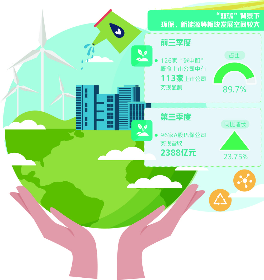 Wind数据显示,在126家“碳中和”概念上市公司中,有113家上市公司前三季度实现盈利。业内人士表示,在“双碳”背景下,环保、锂电等板块发展空间较大,相关上市公司业绩有望持续向好。