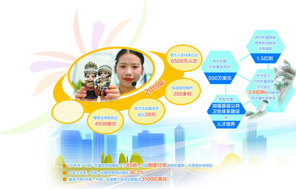 同时,双方还打造了中国—东盟教育交流周、中国—东盟中心、文化论坛、减贫发展论坛、中国—东盟合作基金、菁英奖学金等一系列交流合作平台。2019年双方人员往来已达6500万人次,每周往来航班近4500架次,双方互派留学生超过20万,结成了200多对友好城市。
