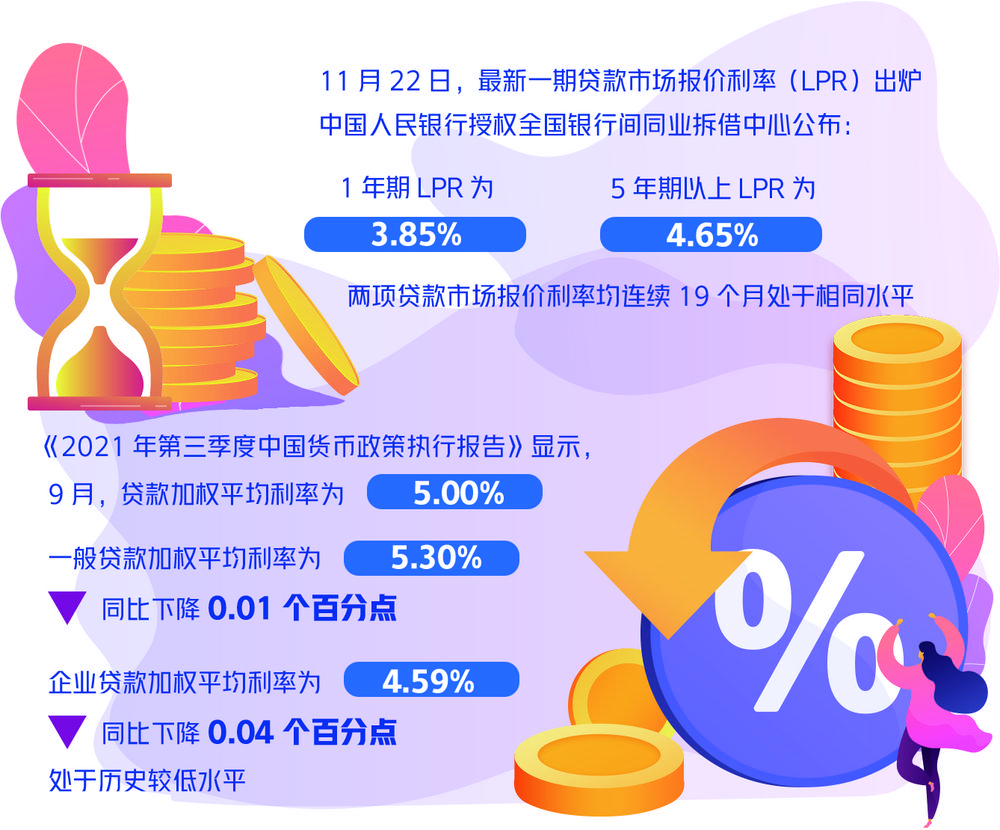 《2021年第三季度中国货币政策执行报告》显示,9月,贷款加权平均利率为5.00%。其中,一般贷款加权平均利率为5.30%,同比下降0.01个百分点。企业贷款加权平均利率为4.59%,同比下降0.04个百分点,处于历史较低水平。