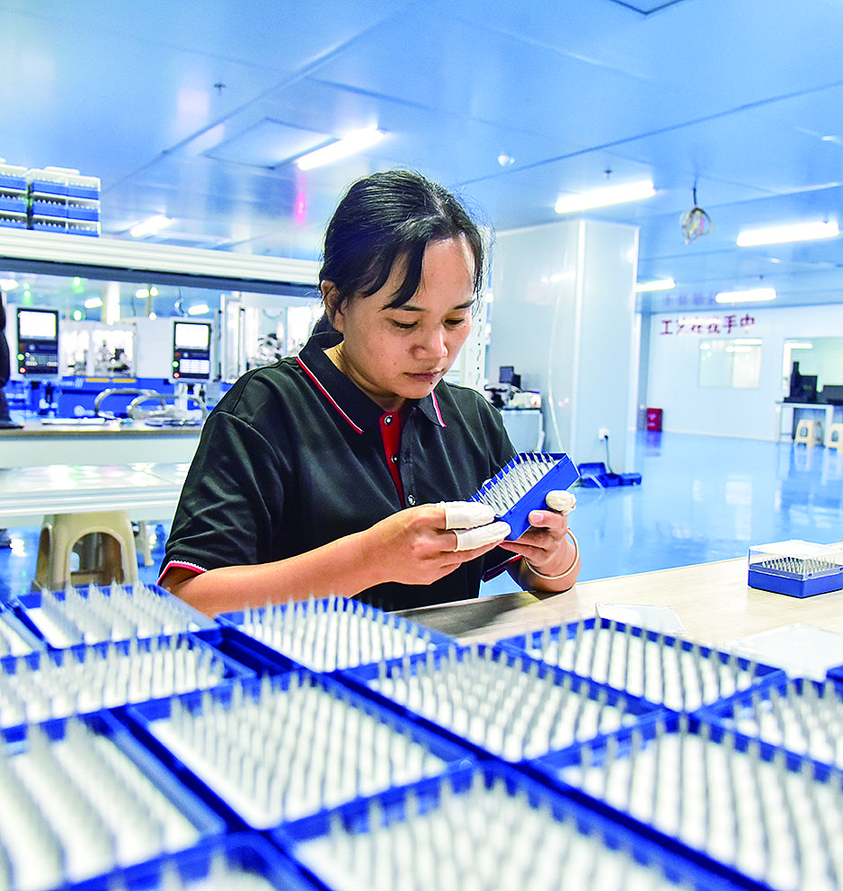 11月23日,位于江西龙南经济技术开发区的龙南华盈精密科技有限公司车间,工人在查看产品。赣深高铁即将开通,一批粤港澳大湾区企业向毗邻的龙南市梯度转移。今年以来,当地共引进大湾区企业签约项目51个,金额373.57亿元。本报记者 赖永峰摄