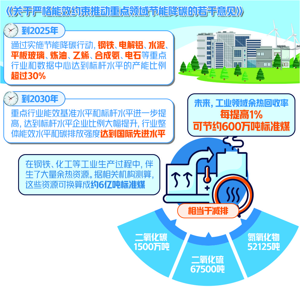 据介绍,《意见》科学界定了重点领域,聚焦了一批能源消耗占比较高、改造条件相对成熟、示范带动作用明显的重点行业,引导企业开展节能降碳技术改造。“比如,《意见》选取的钢铁、电解铝、水泥、平板玻璃、炼油、乙烯、合成氨等,都是单位产品能耗强度高、行业能耗总量大的行业,应该说抓住了我国工业领域节能降碳的主要矛盾和矛盾的主要方面。”时希杰说。