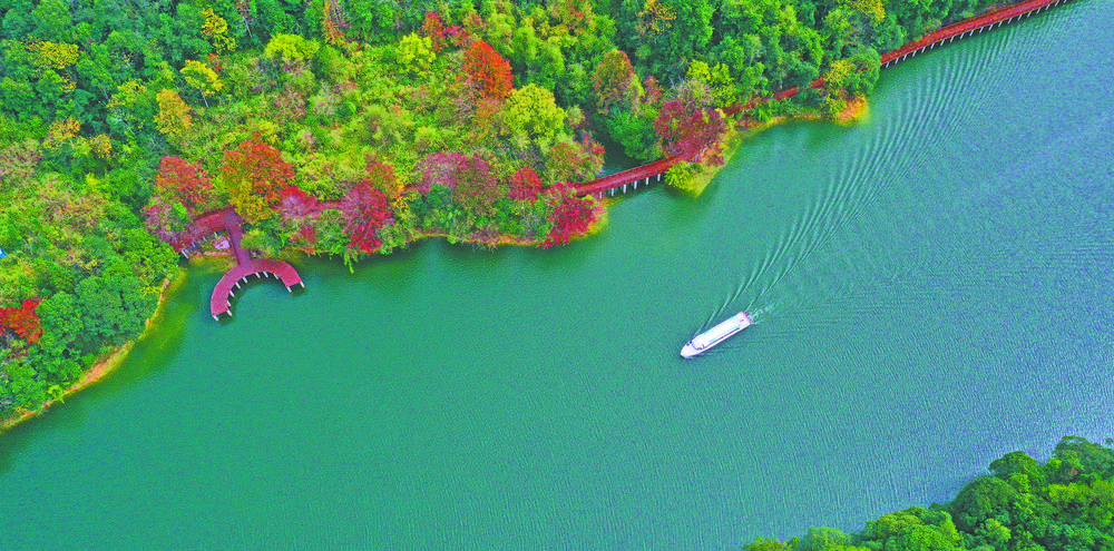 11月25日,保洁船在美景如画的江西省安远县东江源国家湿地公园巡逻作业。安远县坚持走绿色发展道路,牢固树立源头意识,通过不断健全河(湖)长制监管体系,实施水资源保护、水环境治理、水生态修复等措施,呵护东江源生态,已为香港同胞输送56年放心水。