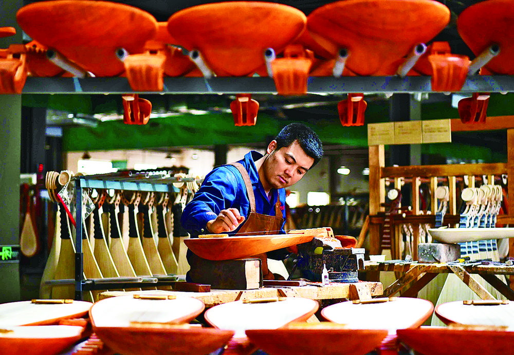11月26日,河北省肃宁县一家乐器生产企业的工人在生产车间制作琵琶。近年来,肃宁县积极引导企业走产业升级之路,推动乐器产业向现代化、企业化生产经营模式转变,打造乐器产业集群。哈聪杰摄(中经视觉)