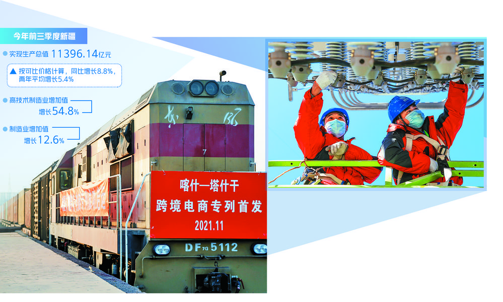 八一钢铁的变身,是新疆迈向高质量发展的缩影。今年前三季度,新疆实现生产总值11396.14亿元,按可比价格计算,同比增长8.8%,两年平均增长5.4%。比增速更可喜的是发展动能的优化。数据显示,全区制造业增加值增长12.6%,高技术制造业增加值增长54.8%,引擎作用愈发明显;服务业加速回暖,1月至8月,规模以上服务业企业实现营业收入1890亿元,比上年同期增长19.1%。