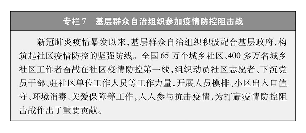 村(居)民自治。村(居)民在基层党组织的领导下,成立村(居)民委员会,依法直接行使民主权利,依法管理基层公共事务和公益事业。实行民主选举,由村(居)民选举村(居)民委员会组成人员;实行民主协商,由村(居)民采取多种形式开展协商议事;实行民主决策,由村(居)民通过村(居)民会议或村(居)民代表会议对社区公共事务和公益事业等作出决定;实行民主管理,由村(居)民讨论决定村(居)民自治章程、村规民约、居民公约等,并进行自我管理;实行民主监督,由村(居)民推选产生村(居)务监督委员会,监督村(社区)事务和村(居)务公开制度落实。截至2020年底,50.3万个行政村全部建立了村民委员会,11.2万个社区全部建立了居民委员会。