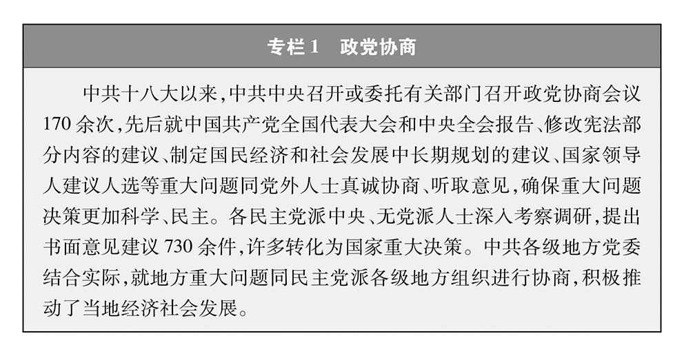 中国共产党和各民主党派、无党派人士以会议协商、约谈协商、书面协商等形式,就国家和地方重大政策和重要事务进行协商。中国共产党自觉接受各民主党派、无党派人士的民主监督。中国共产党和各民主党派、无党派人士在国家政权中合作共事,民主党派成员和无党派人士在各级人大代表、人大常委会组成人员及人大专门委员会成员中均占一定数量,一些民主党派成员和无党派人士担任国家机关领导职务。各民主党派、无党派人士紧紧围绕国家中心工作,积极参政议政、建言献策,为国家发展发挥作用。