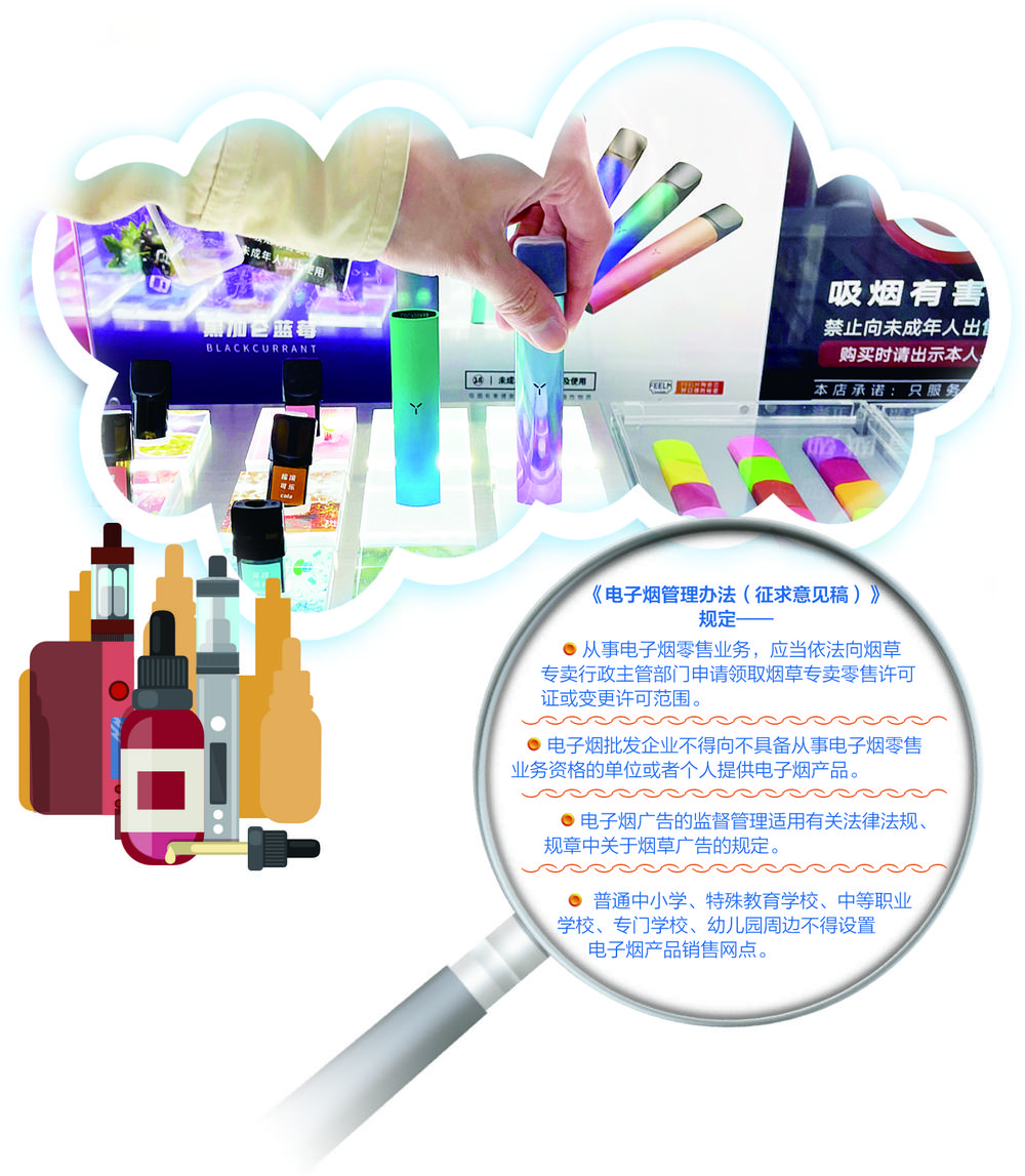 国家烟草专卖局政策法规与体制改革司司长王玉麟介绍说,《电子烟管理办法(征求意见稿)》明确了电子烟定义和监管对象。提出加强电子烟生产管理,建立电子烟产品质量安全保证体系和电子烟产品追溯制度。从事电子烟生产、批发和零售业务的市场主体须相应取得烟草专卖行政主管部门核发的许可证。建立全国统一的电子烟交易管理平台,对电子烟产品、电子烟用烟碱等进行交易管理。电子烟产品应当符合电子烟国家标准以及包装标识和警语的相关规定,并依法使用注册商标。电子烟广告适用烟草广告的有关规定。国务院烟草专卖行政主管部门对电子烟的进出口贸易和对外经济技术合作依法进行监督管理。电子烟税收征缴按照国家税收法律法规执行。