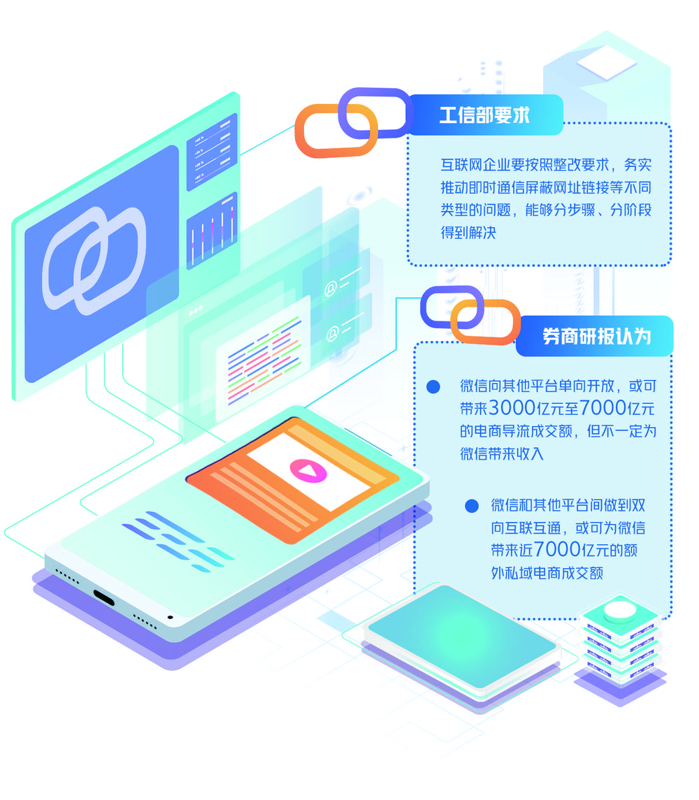近日,微信发布声明称,点对点聊天场景中将可直接访问外部链接,并将在群聊场景试行开放电商类外部链接直接访问功能。记者测试发现,在微信私聊时已可以分享淘宝商品链接,并在点击链接后直接跳转到淘宝页面,还能完成支付。这意味着互联网平台间的互联互通再次升级。国盛证券研报认为,如果微信向其他平台单向开放,或可带来3000亿元至7000亿元的电商导流成交额,但不一定为微信带来收入。如果微信和其他平台间最后能做到双向互联互通,或可为微信带来近7000亿元的额外私域电商成交额。