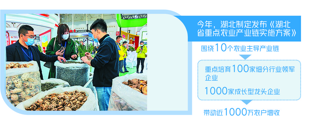 作为农业大省、中部粮仓,湖北粮食生产连续8年保持在500亿斤以上。为推动重点农业产业链建设成势见效,今年,湖北制定发布了《湖北省重点农业产业链实施方案》,湖北茶叶、优质稻米、菜籽油、小龙虾、柑橘、蔬菜、生猪、家禽及蛋制品等重点农业产业链已成立专家团队和工作专班,制订了详细实施方案,成为湖北农业产业化高质量发展的强力引擎。