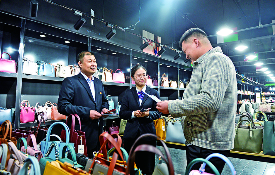 河北高碑店农商银行白沟支行创新金融服务,帮助中小微企业拓展融资渠道。图为近日该行工作人员到当地一家箱包企业介绍贷款产品。李赛赛摄(中经视觉)