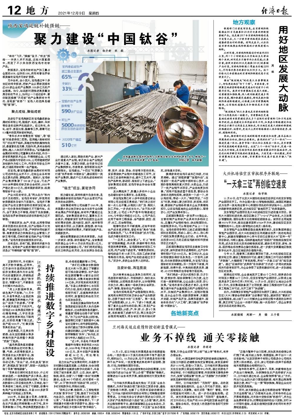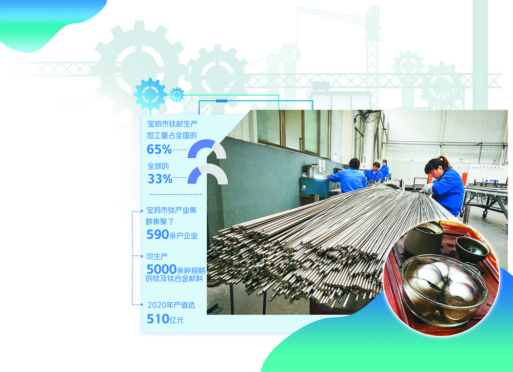 在宝鸡,像宝鸡鑫诺新金属材料有限公司这样的企业并不少,这些企业各有特色且聚点成链、聚链成群。据统计,宝鸡钛产业集群集聚了590余户企业,可生产5000余种规格的钛及钛合金材料,2020年产值达到510亿元,拥有国家级研发、检测等服务平台16家。
